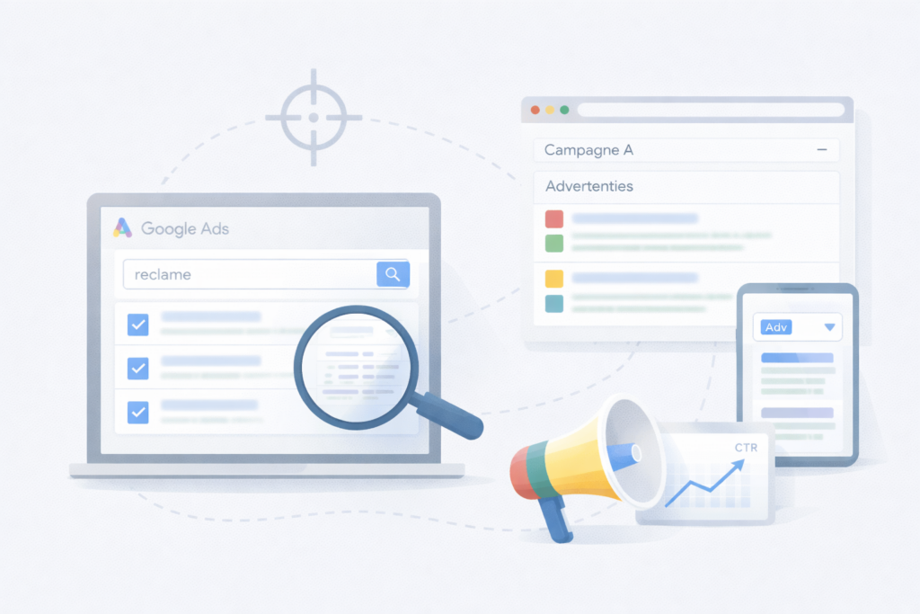 Ik kies de zoekwoorden waarop jij gevonden wilt worden en bouw daar een logische campagnestructuur omheen. Daarna schrijf ik advertenties die aansluiten op de zoekintentie en zet ik alles klaar om gecontroleerd live te gaan.