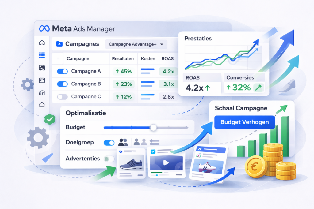 Ik stuur bij op basis van prestaties: budget naar winnaars, verliezers aanpassen of stoppen. Creatives worden vernieuwd, doelgroepen worden opgeschaald en de funnel (ook landingspagina/aanbod) wordt waar nodig verbeterd.